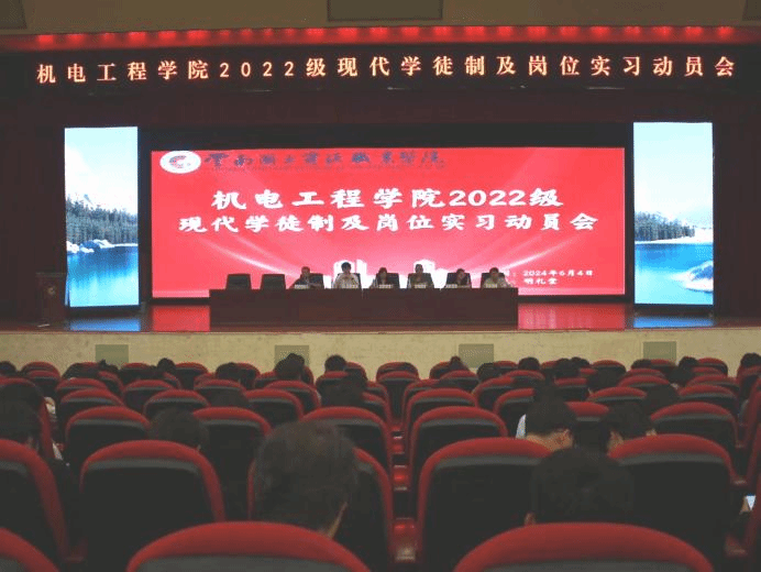 5月4日下午,十大买球的正规网站在明礼堂召开了2024年现代学徒制动员会。本次动员会由学院副院长熊国栋老师主持,保卫处处长陶乃江老师、教务处夏俊伟老师,学院党委书记王春莲老师、院长张俊妍老师、学院就业专员吴大飞老师,以及2022级全体在校同学共同参加。