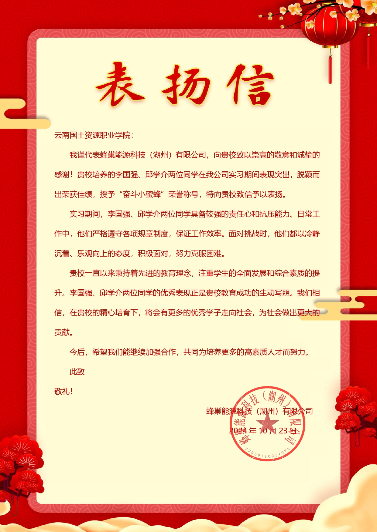 蜂巢能源科技(湖州)有限公司致十大买球实习学生的表扬信