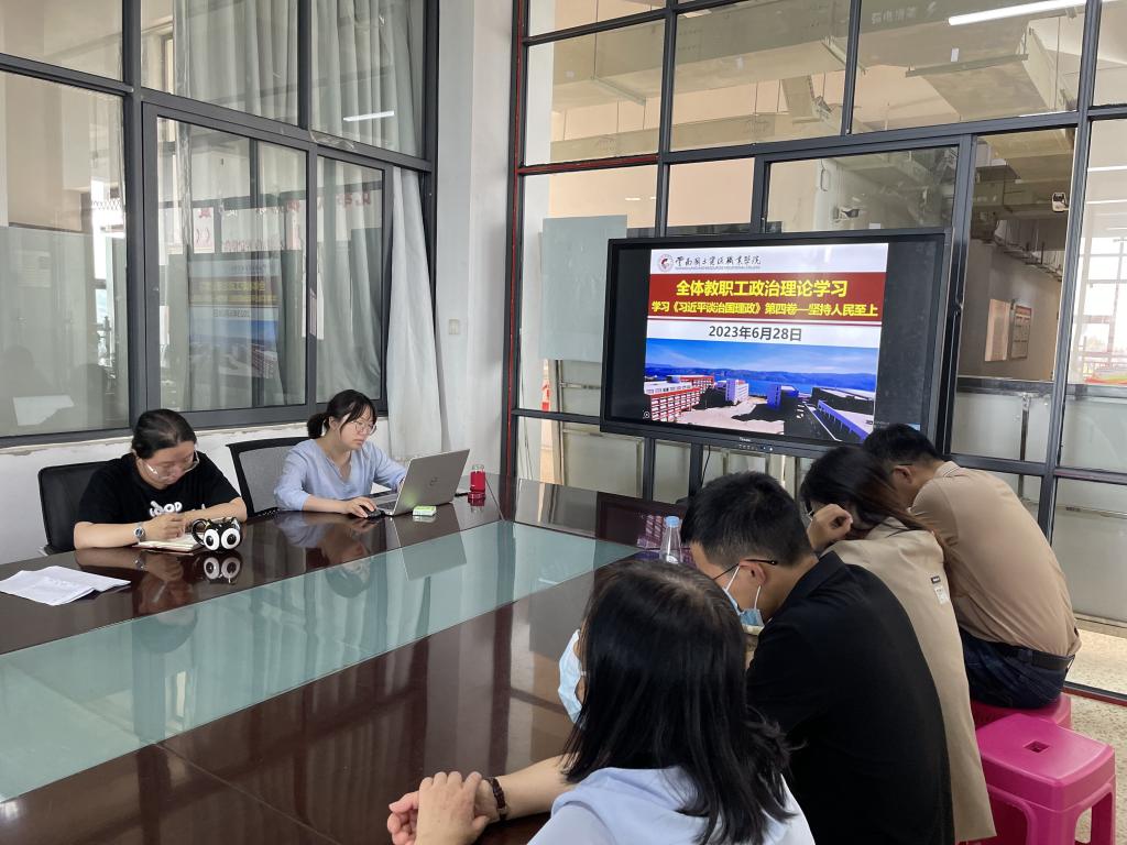 为深入开展学习贯彻习近平新时代中国特色社会主义思想主题教育,引导全院教职工用党的创新理论统一思想、统一意志、统一行动,6月28日,十大买球的正规网站在明尚楼A201开展了2023年6月份第四次教职工政治理论学习会。本次政治理论学习会由学院党总支书记王春莲主持,机电党支部杨正宏同志带领全院教职工学习了《习近平谈治国理政》第四卷:3.1:坚持人民至上。