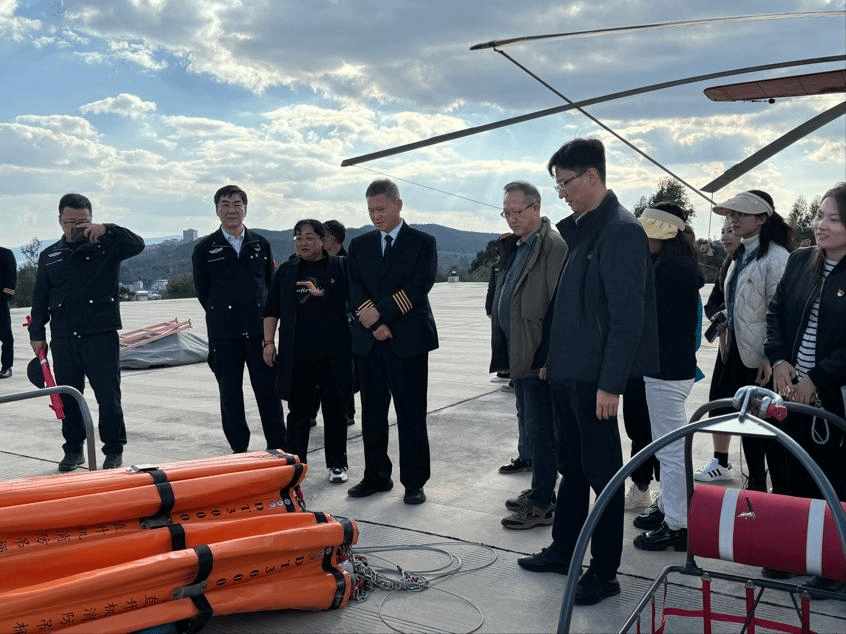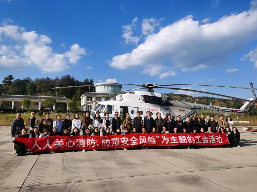 座谈会后,大家到直升机场进行参观,机组人员对消防装备进行了介绍,让大家进一步了解航空消防救援工作,并开展“人人关心消防,防范安全风险”为主题的工会活动。