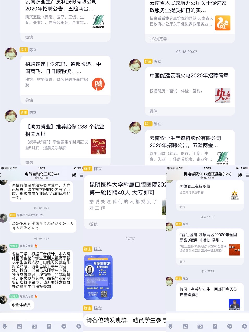 此外,多种手段动员学生积极参加网络双选会,从班主任到全体教职工,从学工办到学院党政领导,各司其职,发起倡议,为学院毕业生努力寻找就业机会。学院就业专员陈立老师,多渠道宣传国家就业政策,发布招聘公告,并主动联系相关企业参加学校2020届毕业生春季网络招聘双选会,不定时推送一些就业指导的相关网络培训和讲座课程,提高学生的面试技巧。根据学校的相关通知,精心组织学生参加“国土首届网络招聘会”,积极进行网络面试,学院学生在网络招聘会中参与度极高。