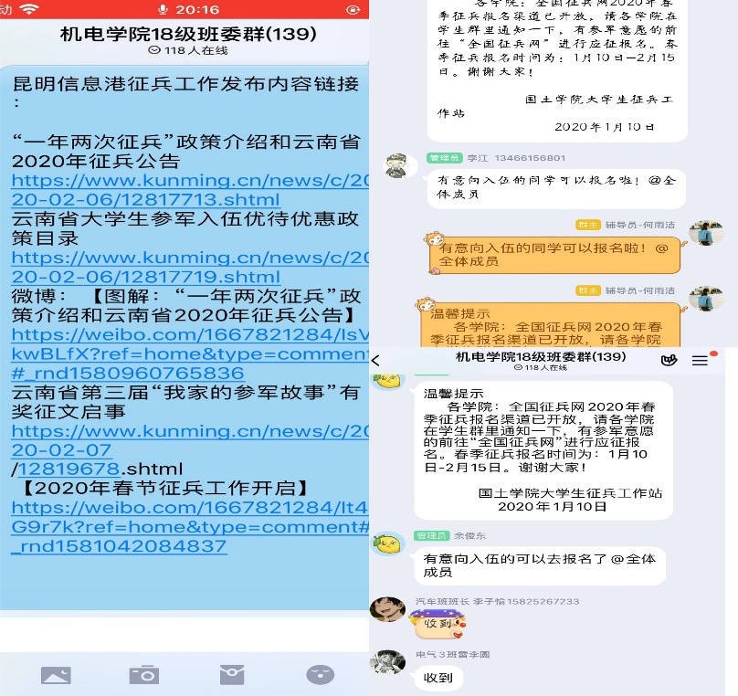 三是征兵工作。自大学生征兵工作启动以来,学院严格落实全国、全省大学生征兵工作要求,开展了大量征兵宣传和动员工作,着力发挥微信平台、QQ平台的作用,广泛宣传征兵工作相关事宜,增强学生爱我国防的意识。疫情期间,依托“腾讯会议”平台召开会议,讨论征兵工作细节,并对征兵工作进行安排,设立专人负责征兵工作,经过各方面动员,截止3月份,学院共45名学生通过当地武装部、网上报名通道等进行了入伍报名。