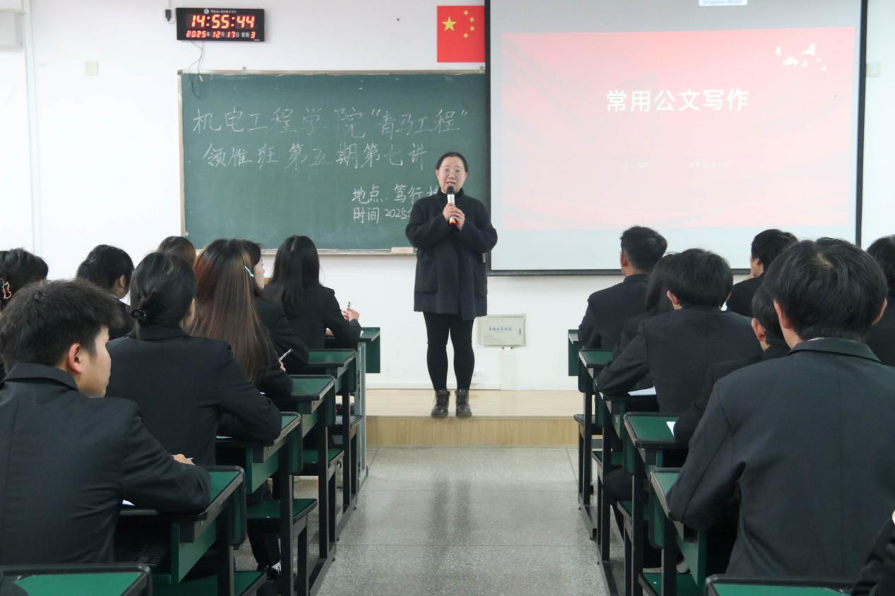 为提升青马学员的公文写作能力,12月17日,十大买球的正规网站“青马工程”领雁班第五期第七讲在笃行楼314教室举行。本次培训由学院学工办主任毛颖老师主讲,团总支副书记普廷云主持,领雁班第五期全体学员参加。