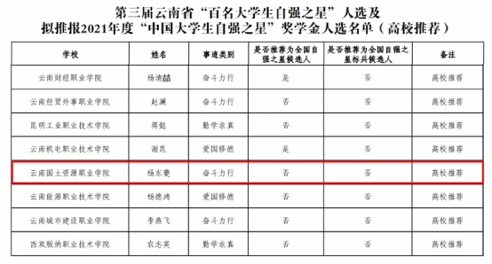 近日,由共青团云南省委、云南省学生联合会及有关单位联合开展的第三届云南省“百名大学生自强之星”寻访活动结果已揭晓,十大买球2020级电气三班团支部杨东夔同学被评为云南省“百名大学生自强之星”。