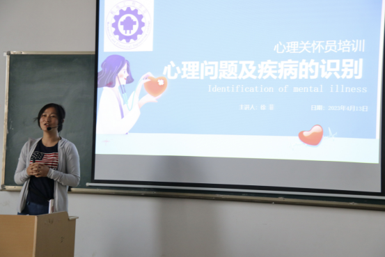 会议开始,徐菲老师指出了心理关怀员工作的重要性,明确了心理关怀员的工作职责,强调了各班心理关怀员应“在其位,谋其职,尽其责”,要掌握一定的专业技能,要为各班同学心理健康负责。随后,她从心理障碍的体现、常见的心理问题、抑郁症的识别这三方面进行讲解。最后,徐菲老师给同学们介绍了心理疾病可就诊的医院及联系方式,并希望各班心理关怀员要认真总结学习,多到宿舍走访了解班级同学心理动态,及时帮忙疏导心理问题,定期上报班级同学心理情况,开展好心理关怀工作。
