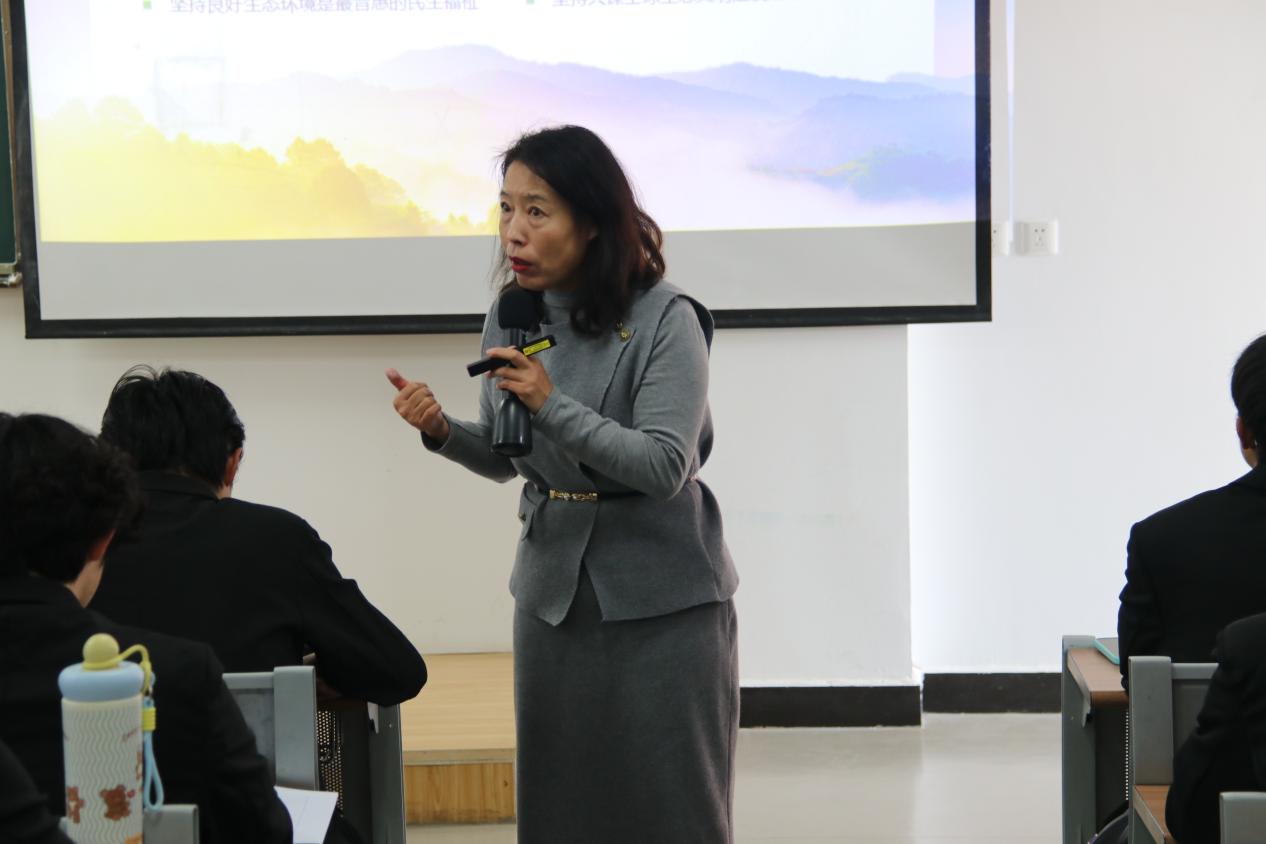 课上,张延星院长从“文化”“文明”两词的英文释义切入,结合四大古国文明阐释“文明”内涵,梳理出原始文明、农业文明、工业文明到生态文明的发展脉络。她指出,习近平生态文明思想是习近平新时代中国特色社会主义思想的重要组成部分,生态兴则文明兴,要坚持党对生态文明建设的全面领导,践行“绿水青山就是金山银山”理念,推动智能化、绿色化、融合化发展。