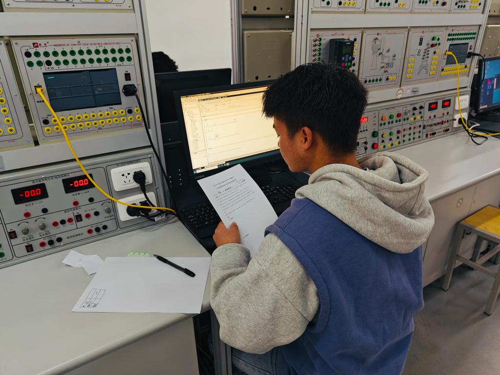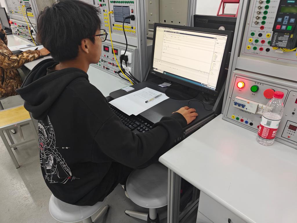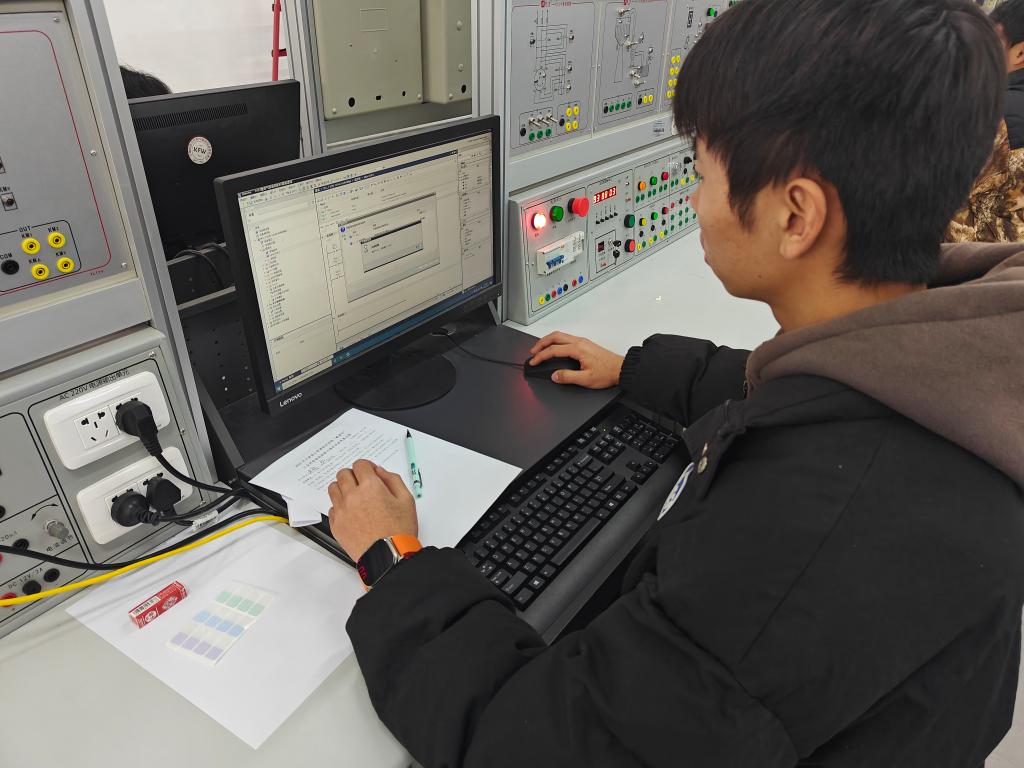 比赛现场,各队选手沉着冷静、娴熟操作,用每一个线路的连接来展示自己扎实的功底,用每一个功能的调试来展示了自己的专业技能水平,高效地运用所学知识技能,高质量地完成每一项操作步骤,展现了机电学子拼搏向上的精神面貌和“精益、专注、创新”的工匠精神。