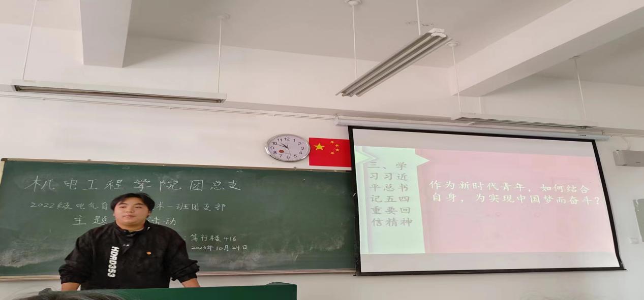 10月24日上午10:30,十大买球的正规网站2022级电气自动化技术1班在笃行楼416召开了“我向大家讲思政”主题团日活动。本次活动由2022级电气自动化技术1班团支部副团书记张银兵主持,全班同学共同参加。