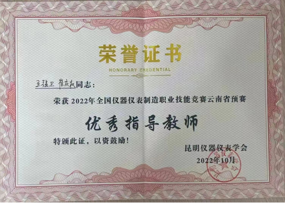 2020级智能控制1班唐周霞、毕健富荣获2022年全国仪器仪表制造职业技能竞赛云南省预赛仪器仪表制造工项目(双人赛)学生组二等奖,指导老师王强卫、崔庆权获优秀指导教师。